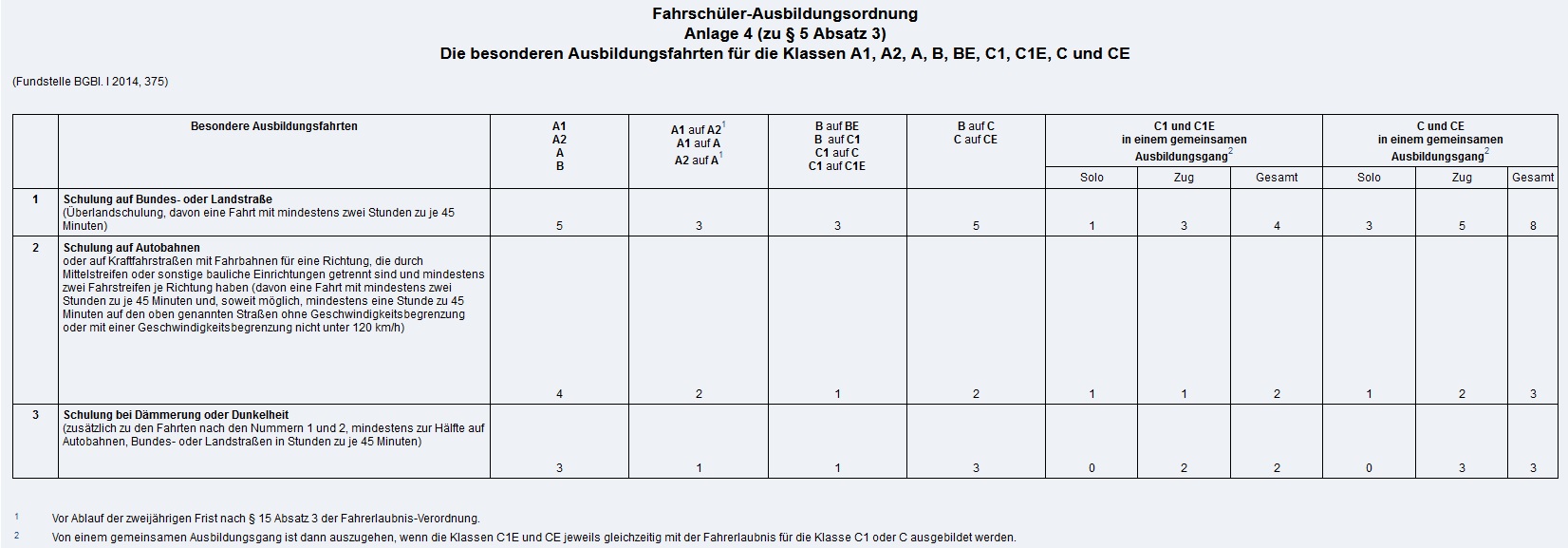 Die besonderen Ausbildungsfahrten für die Klassen A1, A2, A, B, BE, C1, C1E, C und CE Zum Vergrößern bitte klicken (Quelle: Fahrschüler-Ausbildungsordnung).